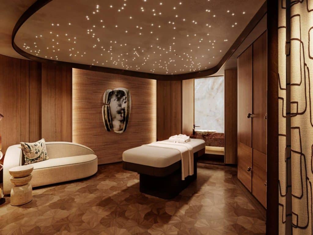 I can see an emergence of traditionalism, coupled with a fearlessness in using color. Moreover, luxury spaces are no longer just designed but also decorated. There’s a re-emergence of antique pieces in very contemporary spaces and great detailing, such as gypsum on the ceiling. However, it still incorporates contemporary features, indicating a mix of design trends, which is emerging and pleasant to observe. I see a lot of jewel colors coming through; I’ve been dabbling in a lot of amber and ruby. Another trend I find really interesting for 2024 is the predominant mixing of metals. Here, and in the gorgeous Atlantis piece we added, there’s a blend of stainless steel, chrome, and a mix of bronze, brass, and copper. I would really welcome moving away from everything being tone-on-tone and matchy-matchy, if you will.