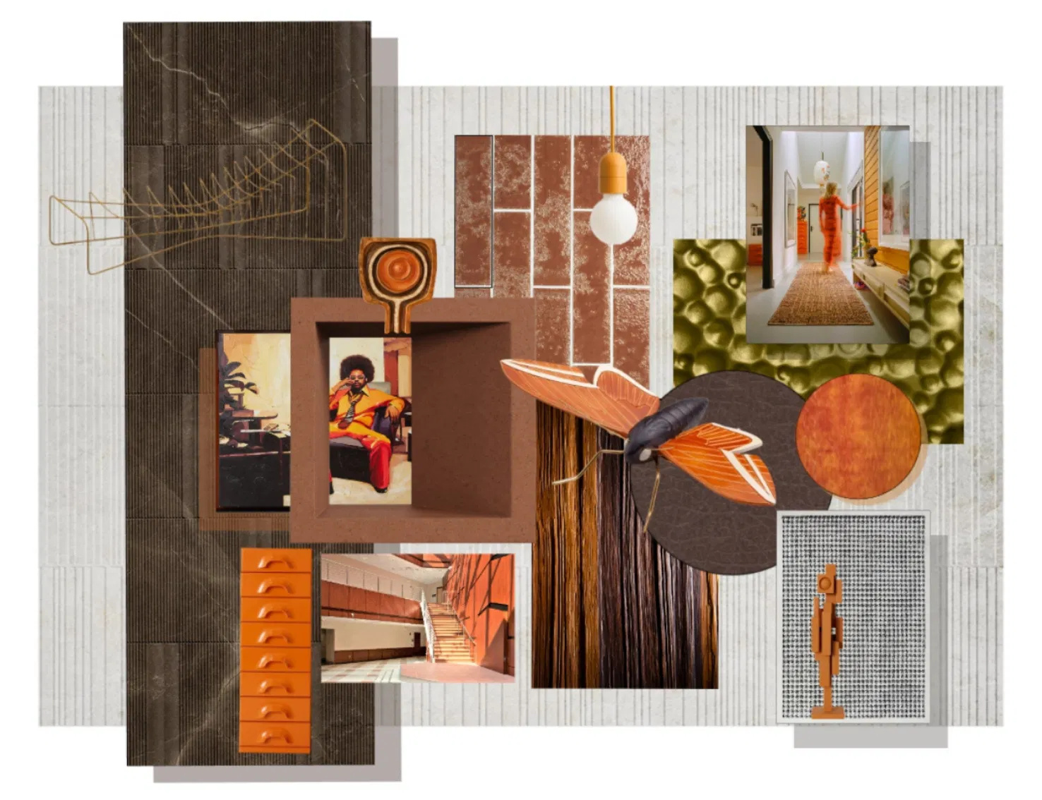 Burnt Amber explores a warmer register of modern interiors, where spiced orange tones, deep woods and olive accents come together through texture rather than ornament. The moodboard balances structured geometry with tactile surfaces — ribbed tiles, patinated finishes and layered materials — creating spaces that feel grounded yet expressive. Architectural references sit alongside sculptural details, suggesting interiors shaped by material memory, warmth and a quiet sense of character rather than overt nostalgia.