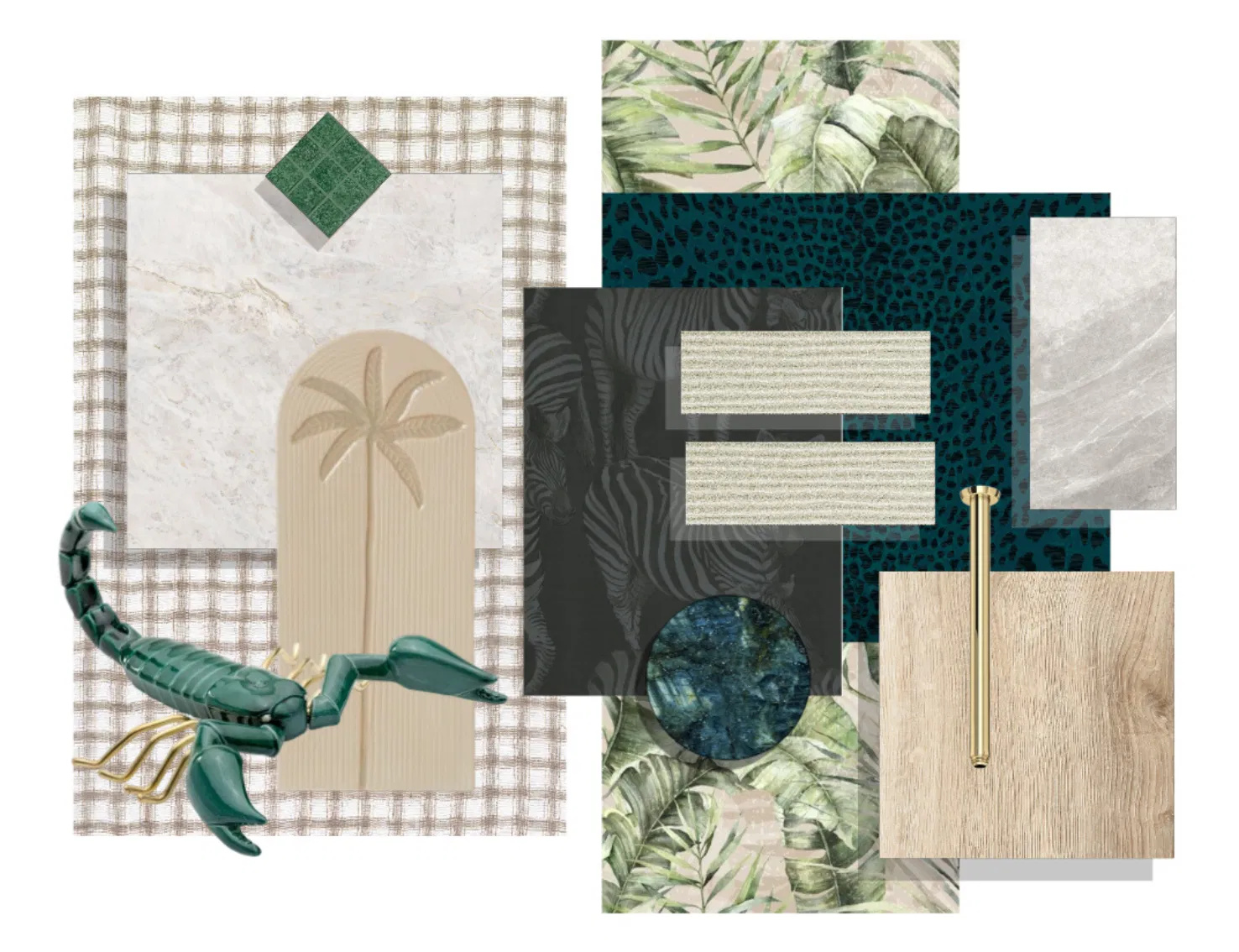 Jungle Chic softens the wild with intention, layering lush greens, animal motifs, and natural textures against calm stone, pale woods, and brushed brass. The result is a refined tropical mood that feels composed rather than chaotic — expressive, grounded, and quietly indulgent.
