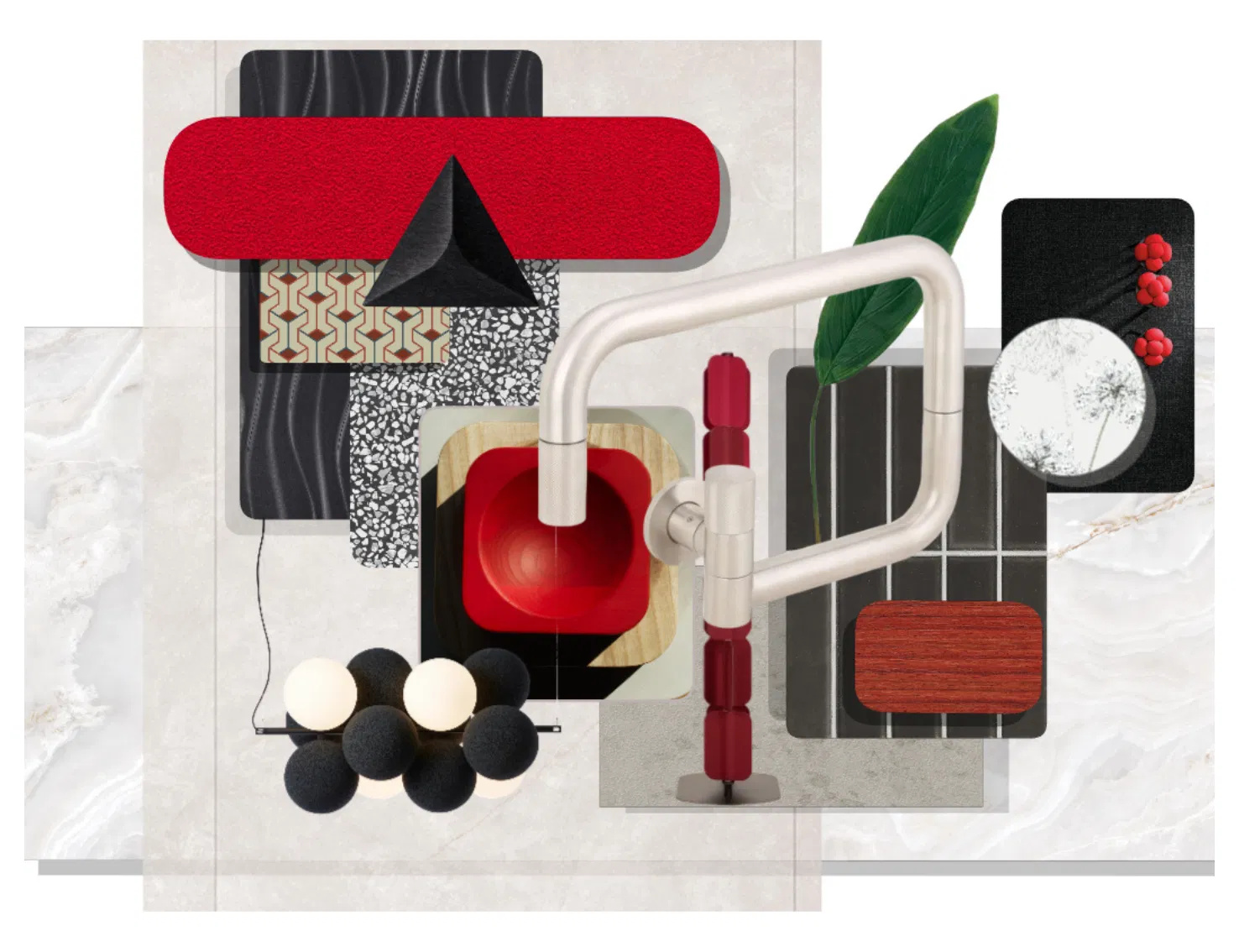 Cherry Pop introduces a deliberate burst of red against a disciplined backdrop of stone, black, and brushed metal. Rather than overwhelming the composition, the colour acts as a focal interruption — punctuating clean lines, geometric forms, and textured surfaces. It’s a study in contrast and control, where a single chromatic note energises the entire palette without disrupting its structure.