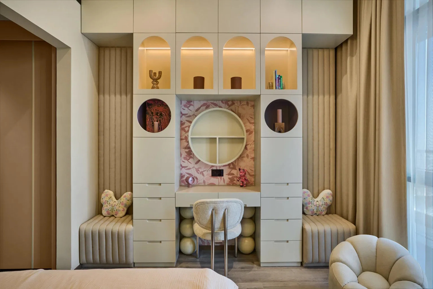 A charming pink leaves Rasch wallpaper was installed in the kids’ room at 45 Downtown Home, adding a playful yet calming touch. The delicate leaf pattern creates a cozy, imaginative, and visually engaging space, perfect for a child’s room.