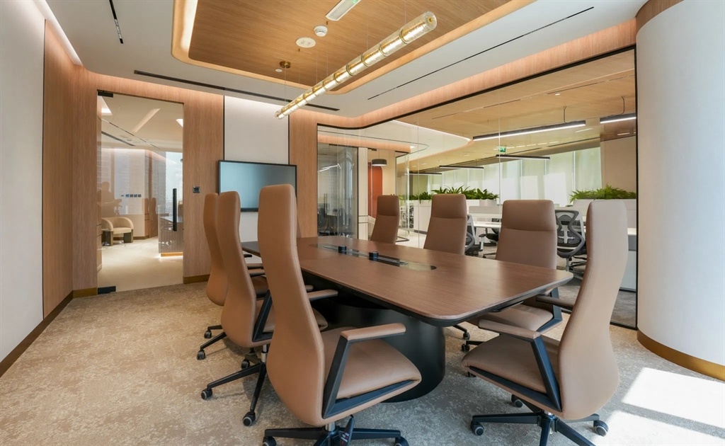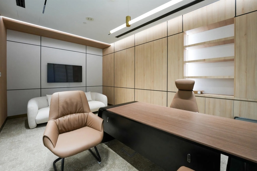 A bespoke application of premium designer wallpaper graces the walls of this executive suite on one of Almas Tower’s upper floors. Installed by NGC—renowned for luxury residential and commercial finishes—the wallpaper features a refined texture with soft metallic sheen that complements warm wood veneer and muted neutral tones throughout the space